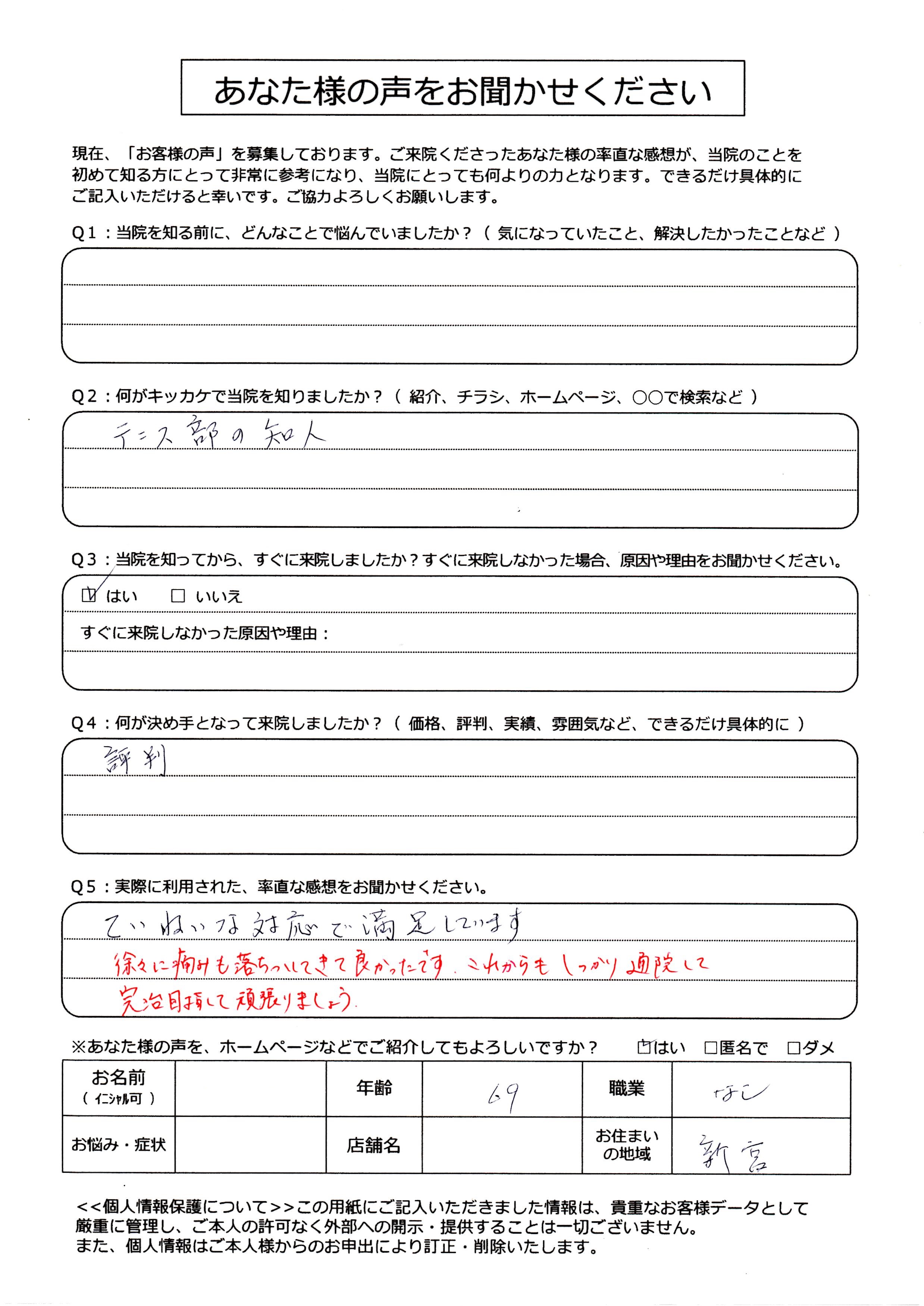 炎症が取れてからは関節の拘縮を防ぐ為、出来る範囲での運動と筋肉をほぐす為に指圧を加え治療を行った所、痛みの改善、可動域の改善もしっかりみられ今では楽しんでテニスが出来るほどに回復する事ができました。