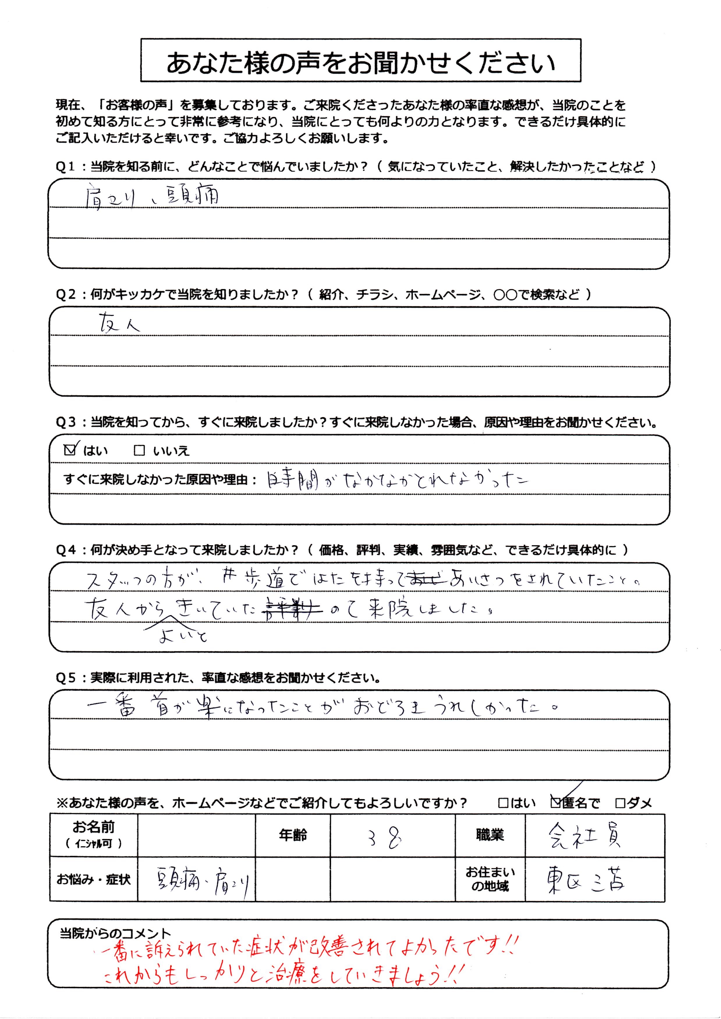 そういった部分からも背骨の歪みを生んでしまい背中の筋肉を伝って首・肩の筋肉に悪い影響を及ぼしている事が原因でしたので首・肩の筋肉だけでなく背中から腰に掛けての筋肉の治療・背骨の歪みを整えていく施術を数回行ったところかなりの改善がみられました。
